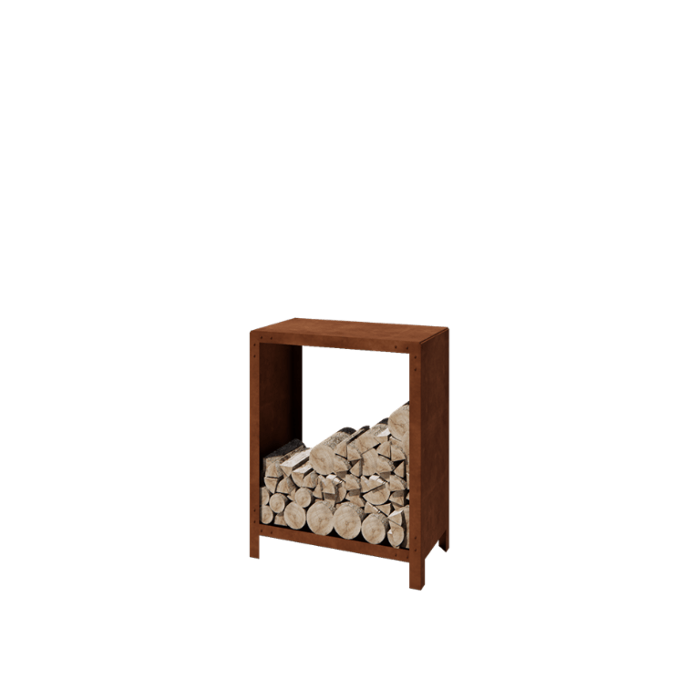 Deze houtopslag is vervaardigd uit hoogwaardig Cortenstaal. Dit staal ontwikkelt een dichte roestlaag die het materiaal beschermt tegen verder doorroesten. Het natuurlijke roestproces start na levering en duurt ongeveer twee maanden, wat de houtopslag een karakteristieke en duurzame uitstraling geeft zonder in te leveren op sterkte.
