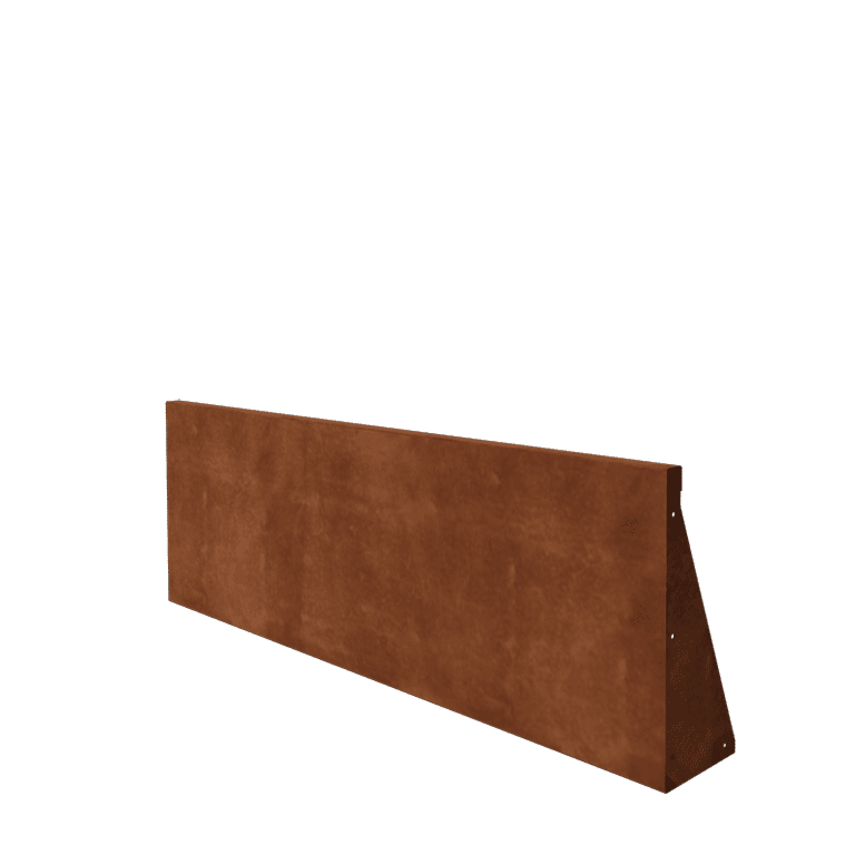 De keerwand heeft een afmeting van 150 x 50 cm en is vervaardigd uit 2 mm dikke plaat Cortenstaal, wat zorgt voor een stevige en robuuste constructie. De keerwand wordt compleet geleverd met montagebeugels en bevestigingsmateriaal, waardoor het eenvoudig is om de keerwand te plaatsen en te koppelen. Dankzij de brede onderrand blijft de keerwand stabiel staan zonder dat vaste bevestiging aan de ondergrond nodig is.