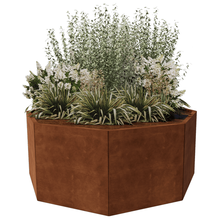 Het type Chicago is een achthoekige plantenbak. Dit is een vorm die je als plantenbak niet of nauwelijks tegenkomt. Dus wil je een plantenbak die je niet op iedere hoek van de straat ziet, dan is dit de perfecte plantenbak voor jou. De plantenbak heeft een robuuste strakke uitstraling en een mooie randafwerking. De unieke vorm van de Chicago is toepasbaar in alle soorten tuinen. Door ons modulaire systeem zijn de bakken heel gemakkelijk in elkaar te zetten.