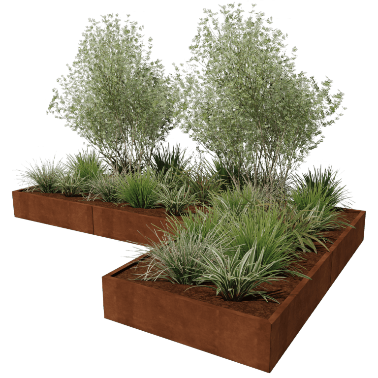 De panelen van onze modulaire plantenbakken worden vervaardigd uit hoogwaardig Corten-A staalplaat. Deze metaalsoort heeft als unieke eigenschap dat het een zeer dichte oxidehuid (roestlaag) vormt. Doorroesten is hierdoor onmogelijk. Door de dichte oxidehuid wordt het dieperliggende materiaal afgeschermd van zuurstof, hierdoor wordt de oxidatie sterk vertraagd terwijl de corrosie zich wel voortzet. De cortenstalen plantenbak wordt ongeroest, in de grijze metaalkleur aangeleverd. Het roestproces begint na weken tot 2 maanden, hier is geen behandeling voor nodig. Tijdens het roestproces kan de plantenbak afgeven. Cortenstaal is een metaallegering die bestaat uit ijzer, waaraan koper, fosfor, silicium, nikkel en chroom zijn toegevoegd.