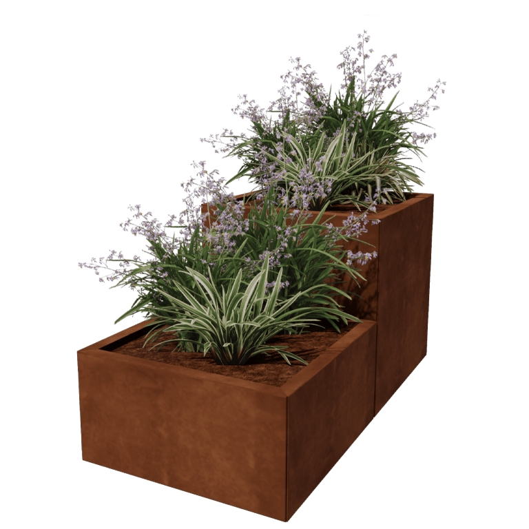 De panelen van onze modulaire plantenbakken worden vervaardigd uit hoogwaardig Corten-A staalplaat. Deze metaalsoort heeft als unieke eigenschap dat het een zeer dichte oxidehuid (roestlaag) vormt. Doorroesten is hierdoor onmogelijk. Door de dichte oxidehuid wordt het dieperliggende materiaal afgeschermd van zuurstof, hierdoor wordt de oxidatie sterk vertraagd terwijl de corrosie zich wel voortzet. De cortenstalen plantenbak wordt ongeroest, in de grijze metaalkleur aangeleverd. Het roestproces begint na weken tot 2 maanden, hier is geen behandeling voor nodig. Tijdens het roestproces kan de plantenbak afgeven. Cortenstaal is een metaallegering die bestaat uit ijzer, waaraan koper, fosfor, silicium, nikkel en chroom zijn toegevoegd.