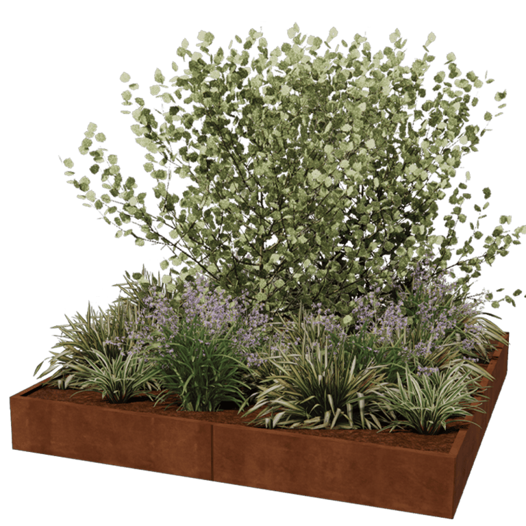 De panelen van onze modulaire plantenbakken worden vervaardigd uit hoogwaardig Corten-A staalplaat. Deze metaalsoort heeft als unieke eigenschap dat het een zeer dichte oxidehuid (roestlaag) vormt. Doorroesten is hierdoor onmogelijk. Door de dichte oxidehuid wordt het dieperliggende materiaal afgeschermd van zuurstof, hierdoor wordt de oxidatie sterk vertraagd terwijl de corrosie zich wel voortzet. De cortenstalen plantenbak wordt ongeroest, in de grijze metaalkleur aangeleverd. Het roestproces begint na weken tot 2 maanden, hier is geen behandeling voor nodig. Tijdens het roestproces kan de plantenbak afgeven. Cortenstaal is een metaallegering die bestaat uit ijzer, waaraan koper, fosfor, silicium, nikkel en chroom zijn toegevoegd.