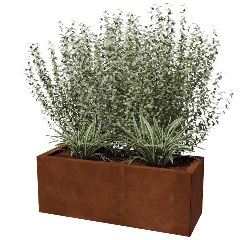 De panelen van onze modulaire plantenbakken worden vervaardigd uit hoogwaardig Corten-A staalplaat. Deze metaalsoort heeft als unieke eigenschap dat het een zeer dichte oxidehuid (roestlaag) vormt. Doorroesten is hierdoor onmogelijk. Door de dichte oxidehuid wordt het dieperliggende materiaal afgeschermd van zuurstof, hierdoor wordt de oxidatie sterk vertraagd terwijl de corrosie zich wel voortzet. De cortenstalen plantenbak wordt ongeroest, in de grijze metaalkleur aangeleverd. Het roestproces begint na weken tot 2 maanden, hier is geen behandeling voor nodig. Tijdens het roestproces kan de plantenbak afgeven. Cortenstaal is een metaallegering die bestaat uit ijzer, waaraan koper, fosfor, silicium, nikkel en chroom zijn toegevoegd.