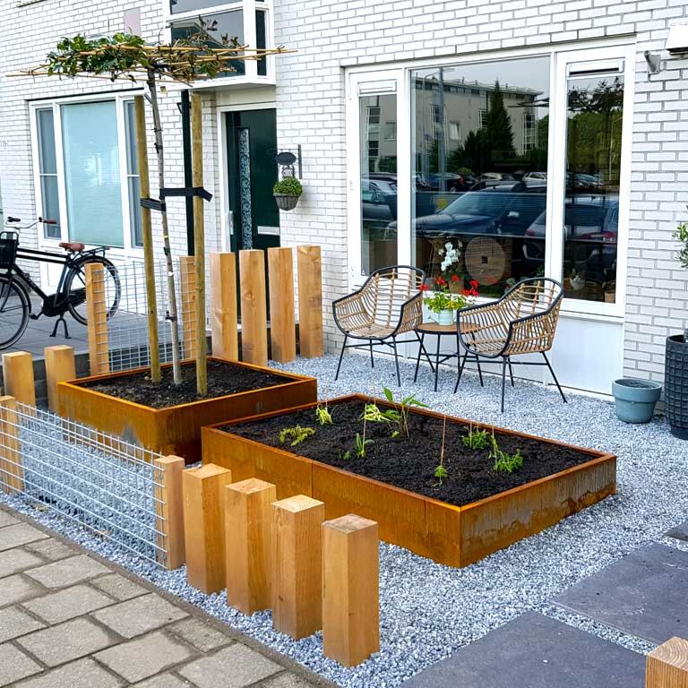 De panelen van onze modulaire plantenbakken worden vervaardigd uit hoogwaardig Corten-A staalplaat. Deze metaalsoort heeft als unieke eigenschap dat het een zeer dichte oxidehuid (roestlaag) vormt. Doorroesten is hierdoor onmogelijk. Door de dichte oxidehuid wordt het dieperliggende materiaal afgeschermd van zuurstof, hierdoor wordt de oxidatie sterk vertraagd terwijl de corrosie zich wel voortzet. De cortenstalen plantenbak wordt ongeroest, in de grijze metaalkleur aangeleverd. Het roestproces begint na weken tot 2 maanden, hier is geen behandeling voor nodig. Tijdens het roestproces kan de plantenbak afgeven. Cortenstaal is een metaallegering die bestaat uit ijzer, waaraan koper, fosfor, silicium, nikkel en chroom zijn toegevoegd.