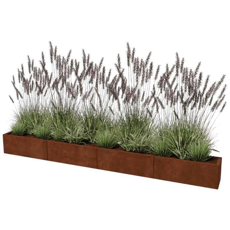 De panelen van onze modulaire plantenbakken worden vervaardigd uit hoogwaardig Corten-A staalplaat. Deze metaalsoort heeft als unieke eigenschap dat het een zeer dichte oxidehuid (roestlaag) vormt. Doorroesten is hierdoor onmogelijk. Door de dichte oxidehuid wordt het dieperliggende materiaal afgeschermd van zuurstof, hierdoor wordt de oxidatie sterk vertraagd terwijl de corrosie zich wel voortzet. De cortenstalen plantenbak wordt ongeroest, in de grijze metaalkleur aangeleverd. Het roestproces begint na weken tot 2 maanden, hier is geen behandeling voor nodig. Tijdens het roestproces kan de plantenbak afgeven. Cortenstaal is een metaallegering die bestaat uit ijzer, waaraan koper, fosfor, silicium, nikkel en chroom zijn toegevoegd.