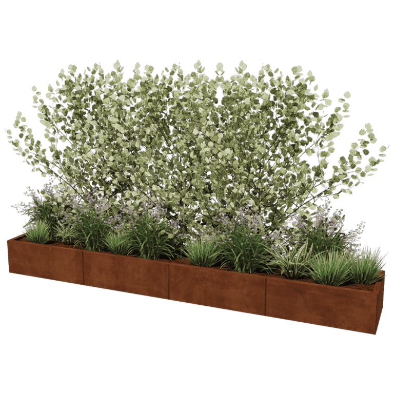 De panelen van onze modulaire plantenbakken worden vervaardigd uit hoogwaardig Corten-A staalplaat. Deze metaalsoort heeft als unieke eigenschap dat het een zeer dichte oxidehuid (roestlaag) vormt. Doorroesten is hierdoor onmogelijk. Door de dichte oxidehuid wordt het dieperliggende materiaal afgeschermd van zuurstof, hierdoor wordt de oxidatie sterk vertraagd terwijl de corrosie zich wel voortzet. De cortenstalen plantenbak wordt ongeroest, in de grijze metaalkleur aangeleverd. Het roestproces begint na weken tot 2 maanden, hier is geen behandeling voor nodig. Tijdens het roestproces kan de plantenbak afgeven. Cortenstaal is een metaallegering die bestaat uit ijzer, waaraan koper, fosfor, silicium, nikkel en chroom zijn toegevoegd.