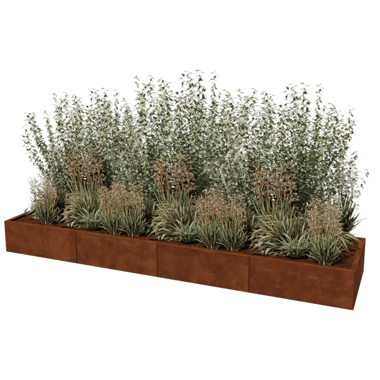 De bodemplaat van de plantenbak is als optie verkrijgbaar en gemaakt uit verzinkt staal met een dikte van 2 mm. De kleur van de bodemplaat wijkt daarmee af van de uiteindelijke roestbruine kleur van je plantenbak.