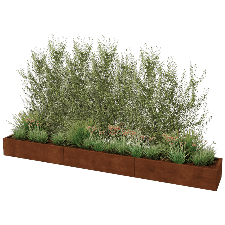 De panelen van onze modulaire plantenbakken worden vervaardigd uit hoogwaardig Corten-A staalplaat. Deze metaalsoort heeft als unieke eigenschap dat het een zeer dichte oxidehuid (roestlaag) vormt. Doorroesten is hierdoor onmogelijk. Door de dichte oxidehuid wordt het dieperliggende materiaal afgeschermd van zuurstof, hierdoor wordt de oxidatie sterk vertraagd terwijl de corrosie zich wel voortzet. De cortenstalen plantenbak wordt ongeroest, in de grijze metaalkleur aangeleverd. Het roestproces begint na weken tot 2 maanden, hier is geen behandeling voor nodig. Tijdens het roestproces kan de plantenbak afgeven. Cortenstaal is een metaallegering die bestaat uit ijzer, waaraan koper, fosfor, silicium, nikkel en chroom zijn toegevoegd.