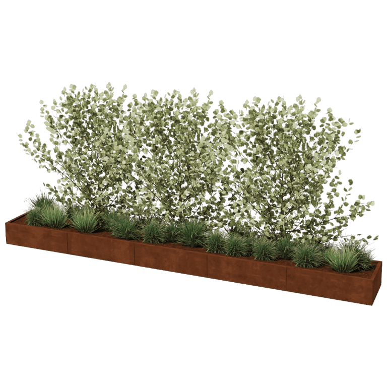 De panelen van onze modulaire plantenbakken worden vervaardigd uit hoogwaardig Corten-A staalplaat. Deze metaalsoort heeft als unieke eigenschap dat het een zeer dichte oxidehuid (roestlaag) vormt. Doorroesten is hierdoor onmogelijk. Door de dichte oxidehuid wordt het dieperliggende materiaal afgeschermd van zuurstof, hierdoor wordt de oxidatie sterk vertraagd terwijl de corrosie zich wel voortzet. De cortenstalen plantenbak wordt ongeroest, in de grijze metaalkleur aangeleverd. Het roestproces begint na weken tot 2 maanden, hier is geen behandeling voor nodig. Tijdens het roestproces kan de plantenbak afgeven. Cortenstaal is een metaallegering die bestaat uit ijzer, waaraan koper, fosfor, silicium, nikkel en chroom zijn toegevoegd.