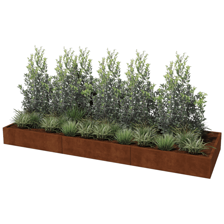 De panelen van onze modulaire plantenbakken worden vervaardigd uit hoogwaardig Corten-A staalplaat. Deze metaalsoort heeft als unieke eigenschap dat het een zeer dichte oxidehuid (roestlaag) vormt. Doorroesten is hierdoor onmogelijk. Door de dichte oxidehuid wordt het dieperliggende materiaal afgeschermd van zuurstof, hierdoor wordt de oxidatie sterk vertraagd terwijl de corrosie zich wel voortzet. De cortenstalen plantenbak wordt ongeroest, in de grijze metaalkleur aangeleverd. Het roestproces begint na weken tot 2 maanden, hier is geen behandeling voor nodig. Tijdens het roestproces kan de plantenbak afgeven. Cortenstaal is een metaallegering die bestaat uit ijzer, waaraan koper, fosfor, silicium, nikkel en chroom zijn toegevoegd.