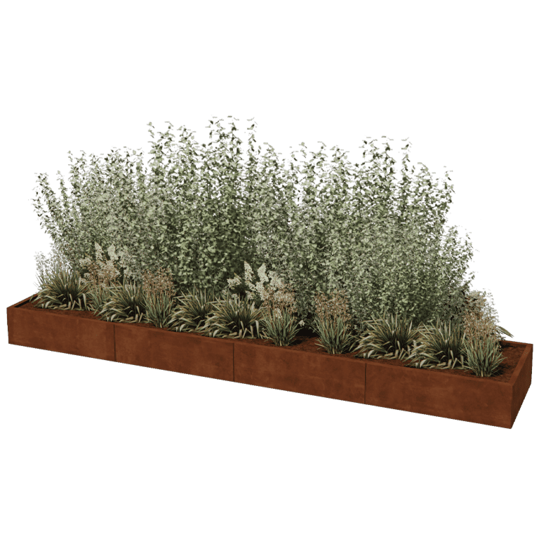 De panelen van onze modulaire plantenbakken worden vervaardigd uit hoogwaardig Corten-A staalplaat. Deze metaalsoort heeft als unieke eigenschap dat het een zeer dichte oxidehuid (roestlaag) vormt. Doorroesten is hierdoor onmogelijk. Door de dichte oxidehuid wordt het dieperliggende materiaal afgeschermd van zuurstof, hierdoor wordt de oxidatie sterk vertraagd terwijl de corrosie zich wel voortzet. De cortenstalen plantenbak wordt ongeroest, in de grijze metaalkleur aangeleverd. Het roestproces begint na weken tot 2 maanden, hier is geen behandeling voor nodig. Tijdens het roestproces kan de plantenbak afgeven. Cortenstaal is een metaallegering die bestaat uit ijzer, waaraan koper, fosfor, silicium, nikkel en chroom zijn toegevoegd.