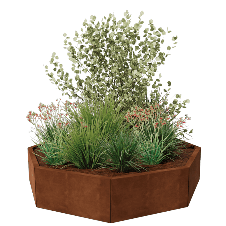 De panelen van onze modulaire plantenbakken worden vervaardigd uit hoogwaardig Corten-A staalplaat. Deze metaalsoort heeft als unieke eigenschap dat het een zeer dichte oxidehuid (roestlaag) vormt. Doorroesten is hierdoor onmogelijk. Door de dichte oxidehuid wordt het dieperliggende materiaal afgeschermd van zuurstof, hierdoor wordt de oxidatie sterk vertraagd terwijl de corrosie zich wel voortzet. De cortenstalen plantenbak wordt ongeroest, in de grijze metaalkleur aangeleverd. Het roestproces begint na weken tot 2 maanden, hier is geen behandeling voor nodig. Tijdens het roestproces kan de plantenbak afgeven. Cortenstaal is een metaallegering die bestaat uit ijzer, waaraan koper, fosfor, silicium, nikkel en chroom zijn toegevoegd.