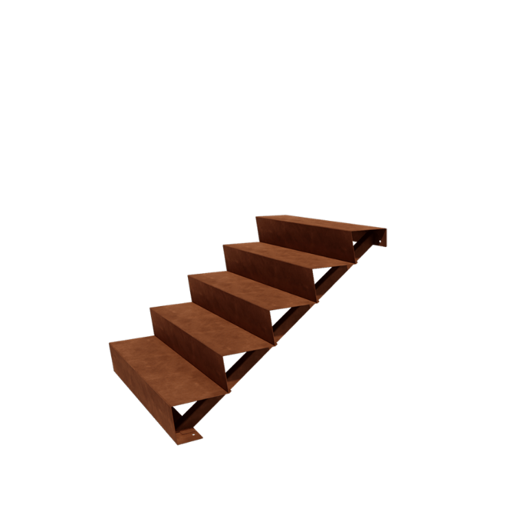 Deze trap is gemaakt van hoogwaardig Cortenstaal. Dit materiaal onderscheidt zich door een unieke oxidelaag die zich in de eerste maanden vormt en beschermt tegen verder doorroesten.