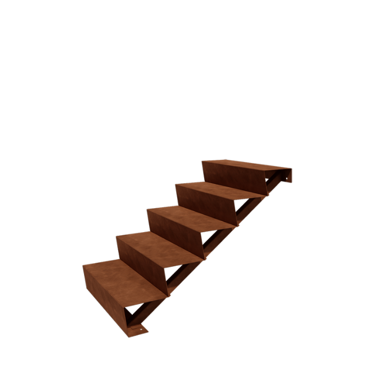 De trap is vervaardigd uit hoogwaardig Cortenstaal. Dit materiaal vormt een dichte oxidehuid die verdere corrosie voorkomt en zo doorroesten onmogelijk maakt. De trap wordt in een ongeroeste, grijze metaalkleur geleverd, waarna het natuurlijke roestproces binnen twee maanden begint, wat zorgt voor een warme en authentieke uitstraling. Cortenstaal is een legering van ijzer met koper, fosfor, silicium, nikkel en chroom voor optimale duurzaamheid.