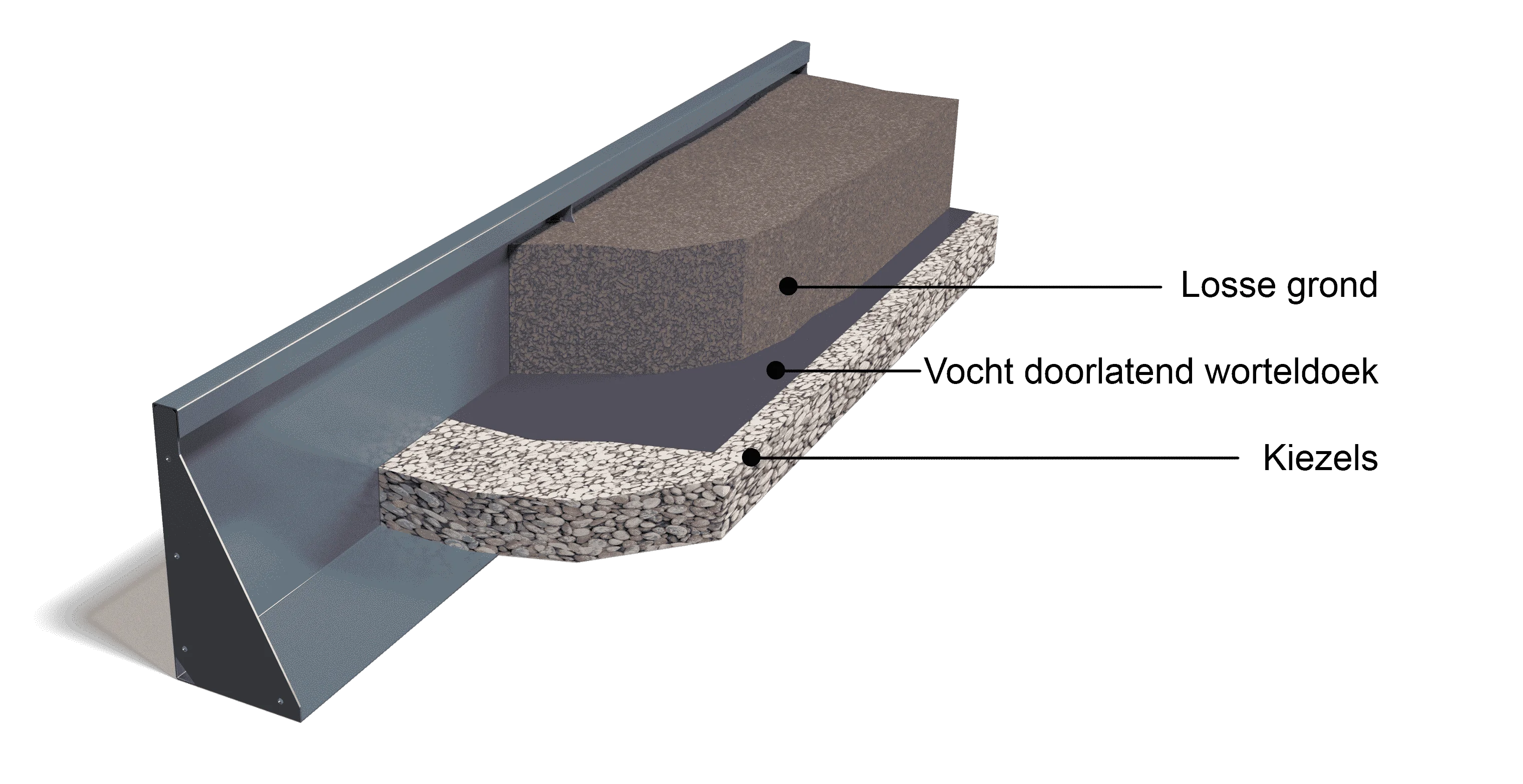 De keerwanden zijn eenvoudig blind aan elkaar te koppelen met de meegeleverde bevestigingsmaterialen. Het is niet nodig om de keerwanden vast te maken aan de ondergrond. Door de brede onderrand en druk van de aarde zal de keerwand rechtop blijven staan.