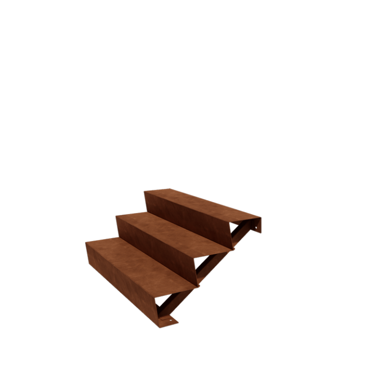 Deze tuintrap is vervaardigd uit hoogwaardig Cortenstaal, een duurzame metaallegering bestaande uit ijzer met koper, fosfor, silicium, nikkel en chroom. Het unieke aan Cortenstaal is de beschermende oxidehuid die ontstaat tijdens het natuurlijke roestproces. Deze laag voorkomt doorroesten en zorgt voor een lange levensduur, zelfs onder wisselende weersomstandigheden.